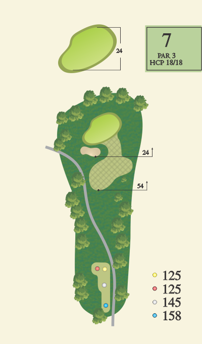 Locals refer to this challenging par 3 as the shortest par 4 on the course. There is a large valley in front of the green that leaves a delicate chip to the green. Balls hit slightly short will roll off the front into the valley. When in doubt on what to hit, take an extra club. This hole plays slightly uphill and wind effects its length as well. The green is wide and narrow making it a challenging green to hit in regulation. Any shot into the bunkers right and left behind the green bring double into play quickly. Overall the green slopes back to front and left to right, with a ridge dividing the left and right side of the green. Hit the right middle of the green and the ball will roll to the right.